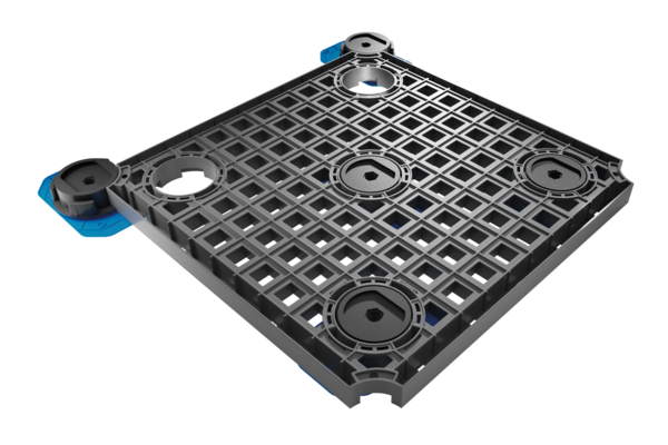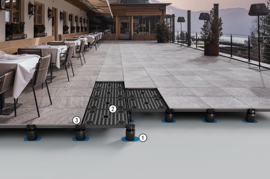 TerraMaxx® PROTECT is a laying system which has been specially developed for higher supported coverings with heavier loading (e.g. gastronomy, event areas). It consists of a glass fibre-reinforced laying module, height-adjustable feet with easy2wall foot technology and freely positionable plate joint crosses. As an overall system, this creates a false floor structure with breakthrough protection for the covering that is laid on top of it.