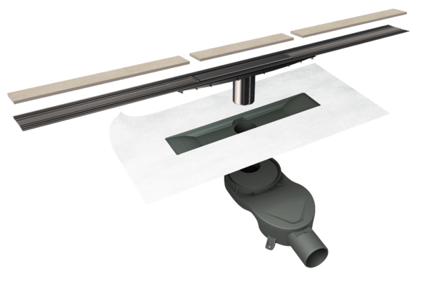 dank schmalem Grundkörper mit thermisch verschweißte Dichtmanschette und einer Estrichabziehlehre für den Einbau mittig oder an der Wand. Unsichtbare, verdeckte Entwässerung in rahmenloser Fliesenoptik, mit integriertem Gefälle. -