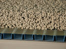 Bevor die eigentliche Sanierung beginnen konnte, musste der Brunnen Stück für Stück abgebaut werden. Dabei wurden die schweren Granitplatten sorgfältig auseinandergenommen und nummeriert, dann von Mörtelresten befreit, ihre Oberfläche geschliffen und poliert. Gleichzeitig ging es an die Überarbeitung des Brunnenbeckens: Dafür wurde der geneigte Betonboden ganzflächig abgefräst und die Aufkantungen zu den Rändern neu betoniert. Anders als zuvor erhielt der Betonkranz zum Untergrund eine bewehrte Verbindung. Danach wurden die Untergründe des Beckens einschließlich des Technikschachtes mehrlagig mit einer mineralischen Dichtschlämme abgedichtet. Auf der Abdichtung kam dann eine Drainagematte von Gutjahr zu einem eher ungewöhnlichen Einsatz: „AquaDrain EK wurde eigentlich speziell für die Verlegung von Naturstein auf Drainmörtel entwickelt. In diesem besonderen Fall sorgt sie dafür, bei der Stilllegung des Brunnens vor dem Winter das Wasser aus der Mörtelschicht komplett abzuleiten. So werden Frostschäden und Ausblühungen wirksam vermieden“, erklärt Gutjahr-Geschäftsführer Ralph Johann. Die Funktionsweise von AquaDrain EK: Das System ist kapillarpassiv und stelzt den Belag komplett auf. Dadurch bilden die Drainkanäle einen großen Hohlraum, Wasser kann schneller und effektiver abfließen. Gleichzeitig gelangt Stauwasser auf der Abdichtung nicht mehr zurück in die Belagskonstruktion. Das vermeidet Schäden. Durch die Unterlüftung trocknet der Belag zudem schneller ab. Eine weitere Besonderheit des innovativen Systems ist das Gittergewebe. Es bleibt dauerhaft wasserdurchlässig, das heißt, es setzt sich auch nicht durch die löslichen Kalke im Drainmörtel zu. Fachbetrieben bietet Gutjahr sechs Jahre Gewährleistung auf das System.