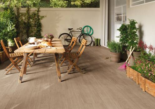 Großformatige Keramikelemente liegen bei der Gestaltung von Balkonen und Terrassen schon lange im Trend. Nun sind auch Oberflächen in Holzoptik im Kommen. Passend dazu bietet Gutjahr den Spezial-Fugenfüllstoff MorTec SOFT ab sofort in der Farbe Dunkelbraun an – für geschlossene Fugen und eine einheitliche Optik ohne störende Bewegungsfugen.