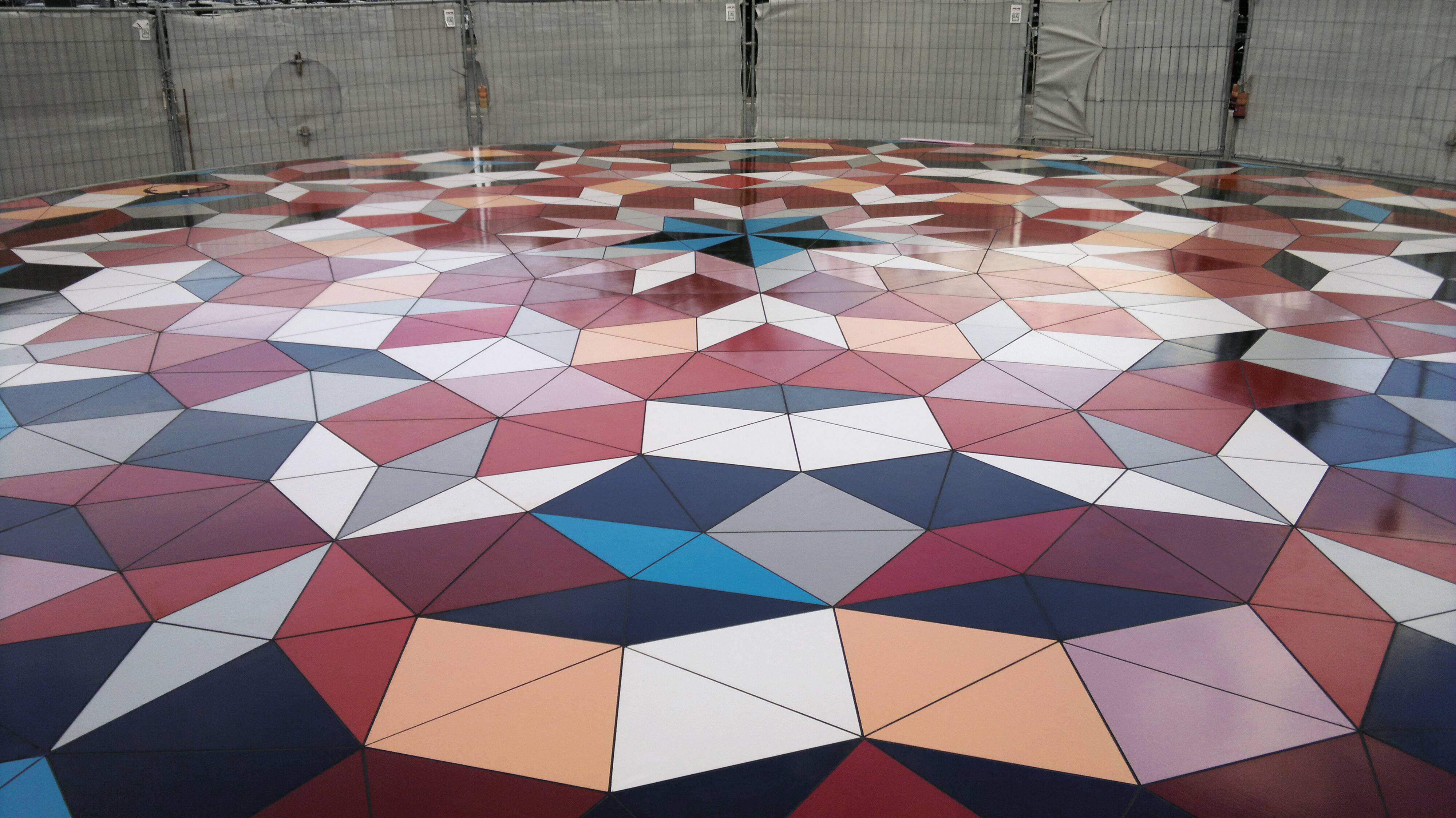 Denn grundsätzlich sind Fliesen der ideale Belag für ein solches Projekt – sofern die Konstruktion ausreichend entwässert wird. Und genau hier lag die Herausforderung von Reglis Kunstwerk. Der Unterbau des Mandalas besteht aus einer Schottertragschicht, auf der ein Ortbeton im Gefälle eingebaut wurde. Eingefasst wird das Ganze von einem Betonring aus sechs vorgefertigten Elementen. Mit 1,2 % lag das Gefälle unter den laut SIA-Norm geforderten 1,5%. Hinzu kamen 732 Meter Fugen. Durch diesen hohen Fugenanteil musste mit einem erhöhten Eintrag von Sickerwasser gerechnet werden. Zwei weitere kritische Punkte: Zum einen konnte der Drainmörtel nicht direkt auf dem Beton aufgebracht werden – Drainmörtel alleine sind nicht kapillarbrechend, das heißt Stauwasser steigt im Mörtel auf und hätte innerhalb kürzester Zeit zu Ausblühungen in den Fugen geführt. Zum anderen durfte die Entwässerung auf keinen Fall sichtbar sein. Denn das hätte den Gesamteindruck des Kunstwerks massiv beeinträchtigt. Aufgrund dieser Anforderungen kam schließlich die Flächendrainage AquaDrain EK von Gutjahr zu ihrem „künstlerischen“ Einsatz – für Martin Smid vom Verarbeitungsbetrieb HESS AG LIESTAL eine perfekte Lösung. „Zur Sicherheit haben wir aber bei Gutjahr nachgefragt, ob die Verlegung auch unter diesen Umständen möglich ist.“ Der Entwässerungsspezialist konnte guten Gewissens zustimmen. „Die unter dem Mandala verlegte Flächendrainage AquaDrain EK mit 16 mm Höhe behält ihre volle Funktionsfähigkeit schon bei einem Gefälle von 1,0 %. Wichtig ist nur, dass sich keine Pfützen mit mehr als 12 mm stehendem Wasser bilden“, sagt Gutjahr-Geschäftsführer Ralph Johann. Lösung: Hochleistungsdrainage