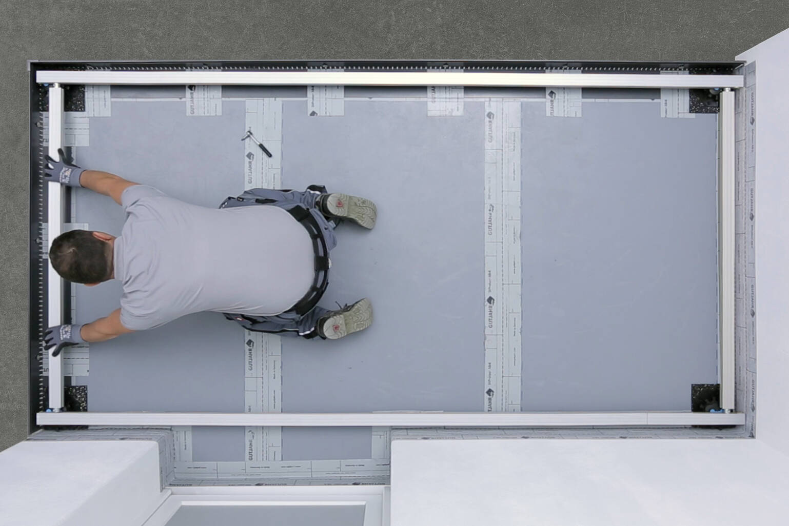 Der „Clou“ von TerraMaxx RS ist die schnelle und einfache Verarbeitung. „Dafür sorgt vor allem der intelligente T-Stoß-Verbinder, mit dem die Aluminiumschienen miteinander verbunden werden“, so Wulst. „Es muss nichts vorgebohrt oder mehrfach verschraubt werden. Verarbeiter benötigen nur einen Inbusschlüssel. Das spart über 20 Prozent Verarbeitungszeit im Vergleich mit ähnlichen Systemen.“ Ebenfalls praktisch: Die Fugenkreuze können direkt auf dem Rahmen fixiert werden. TerraMaxx RS ist auf nahezu allen Untergründen einsetzbar, auch etwa auf ungebundenen Untergründen. „Die Rahmenkonstruktion kann sehr einfach mit Platten- oder Stelzlagern in der Höhe und in der Neigung eingestellt werden“, erklärt Rayc Wulst. „Dadurch ist auch das Gefälle der Konstruktion einfach zu erstellen.“ Für noch mehr Sicherheit sorgt ein sogenanntes Gleitgewebe zwischen Belag und Rahmen. „Dadurch, dass sich Aluminium stärker ausdehnt als Keramik, empfehlen wir das als Entkopplungsschicht“, so der Gutjahr-Experte. Die Fugenkreuze mit Selbstklebe-Pad werden dann auf dem Gewebe fixiert. Weiterer Vorteil: Die Beläge können nicht nur offenfugig verlegt werden, sondern auch mit geschlossenen Fugen – etwa als direkte Fortführung der Innenraumverlegung. Dafür bietet Gutjahr den Spezial-Fugenfüllstoff MorTec SOFT an. Das vereinfacht auch die Reinigung der Belagsoberflächen.