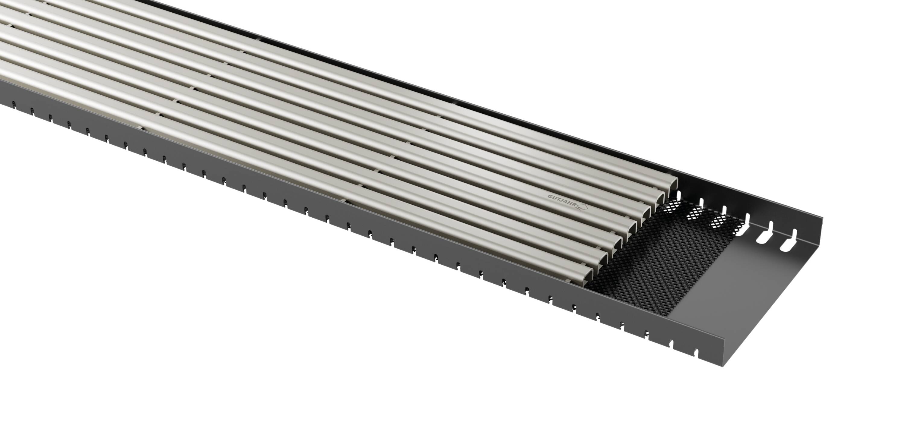 Ein integriertes Schmutzgitter schützt die Drainschicht vor grobem Schmutzeintrag, die Rinne ist variabel ablängbar und lässt sich flexibel anpassen.