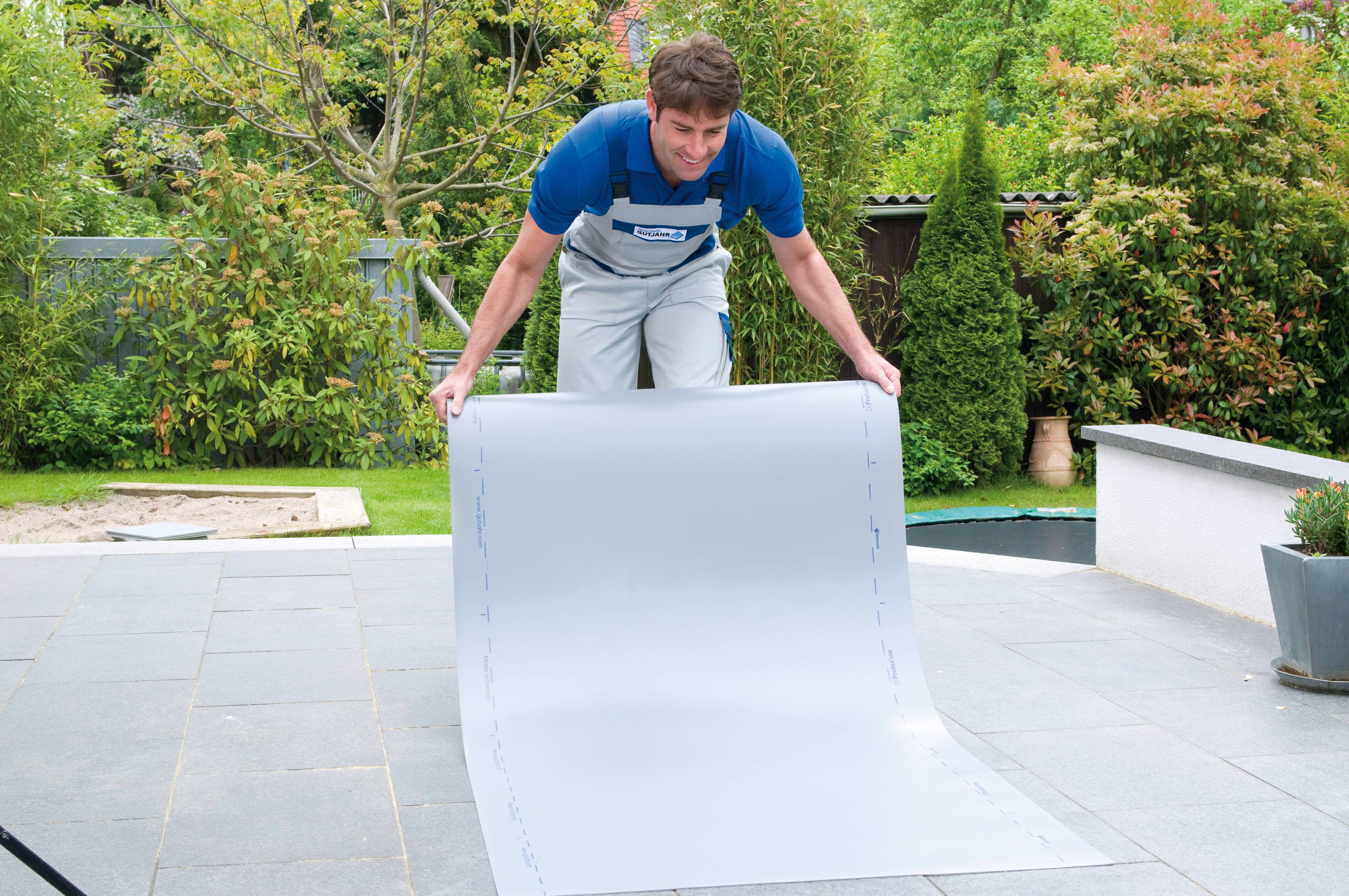 Einfach, sicher und blitzschnell verlegt: Mit DiProtec SDB von Gutjahr sparen Verarbeiter bei der Abdichtung von Balkonen und Terrassen bis zu 80 Prozent ihrer Zeit – im Vergleich zu mineralischen Dichtschlämmen oder Flüssigabdichtungen. Denn die Schnellabdichtung aus hochreißfestem Kunststoff wird lose verlegt. Dadurch kommt sie ohne Grundierungsarbeiten, Trocknungszeiten und Arbeitsunterbrechungen aus. Und: Das System passt perfekt zu allen Gutjahr-Flächendrainagen und Stelzlager-Systemen.