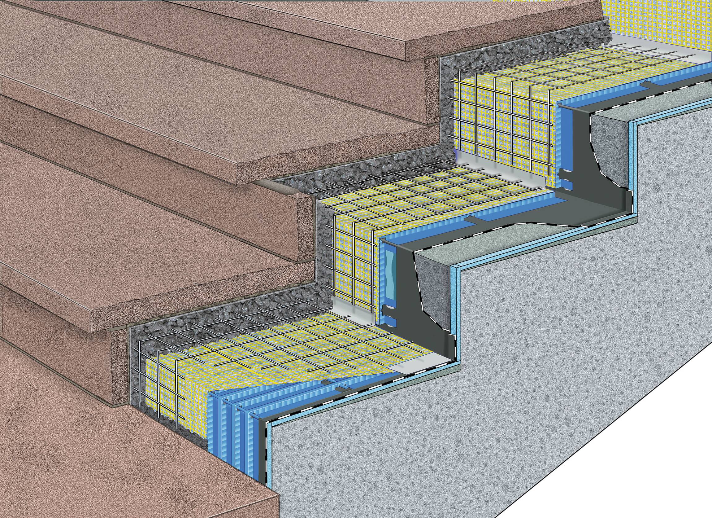 Beim City-Tunnel Leipzig kamen deshalb zwei Systeme von Gutjahr zum Einsatz: die Treppendrainage AquaDrain SD auf den Stufen, die Flächendrainage AquaDrain EK auf den Podesten. Beide Systeme stelzen den Belag komplett auf. Dadurch bilden die Drainkanäle einen definierten Hohlraum, Wasser kann schneller und effektiver abließen. Gleichzeitig gelangt Stauwasser auf der Abdichtung nicht mehr zurück in die Belagskonstruktion, um Schäden anzurichten. Außerdem trocknet der Belag durch die Hinterlüftung schneller ab. Ein Spezialgittergewebe beziehungsweise Spezialvlies dient als Abdeckung und bleiben dauerhaft wasserdurchlässig – ein großer Unterschied zu anderen Systemen. „Das Besondere an unseren Stufendrainagen ist zudem die Beschaffenheit: Die vorgeformten Winkelelemente lassen sich direkt auf den Treppen verarbeiten und müssen nicht extra zugeschnitten werden – das spart Zeit und vermeidet Verlegefehler“, so Ralph Johann von Gutjahr. Herausforderung Aufbauhöhe
