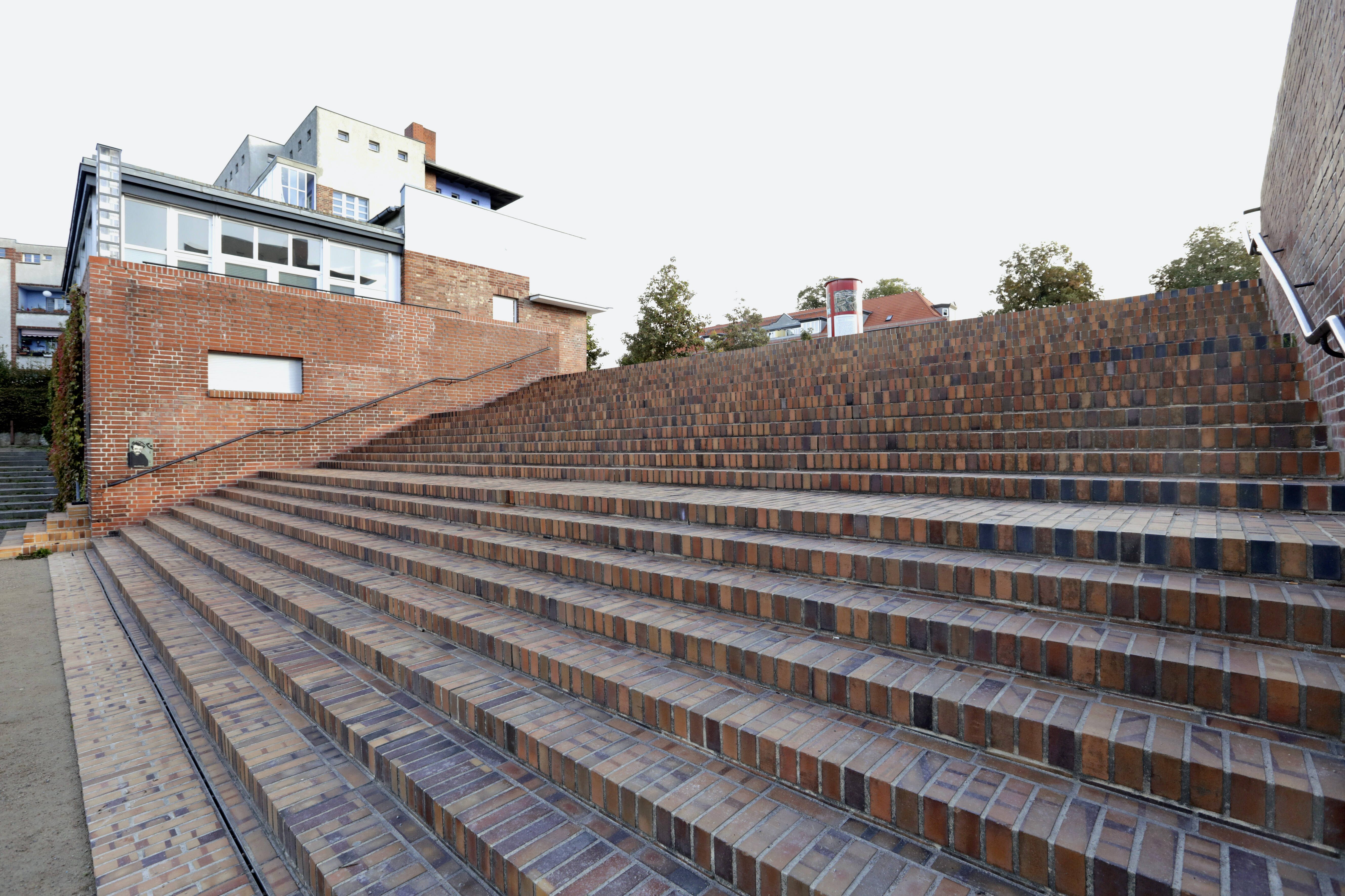 Der neue Belag auf der Treppenanlage – ein eigens modellierter Klinker mit speziellen Maßen – sollte über der alten Treppe verlegt werden, die bis zu den Randbereichen freigelegt worden war. Gleichzeitig durfte der ursprüngliche Charakter der zum Weltkulturerbe gehörenden Anlage nicht verändert werden. Verlangt war unter anderem eine niedrige Aufbauhöhe.
