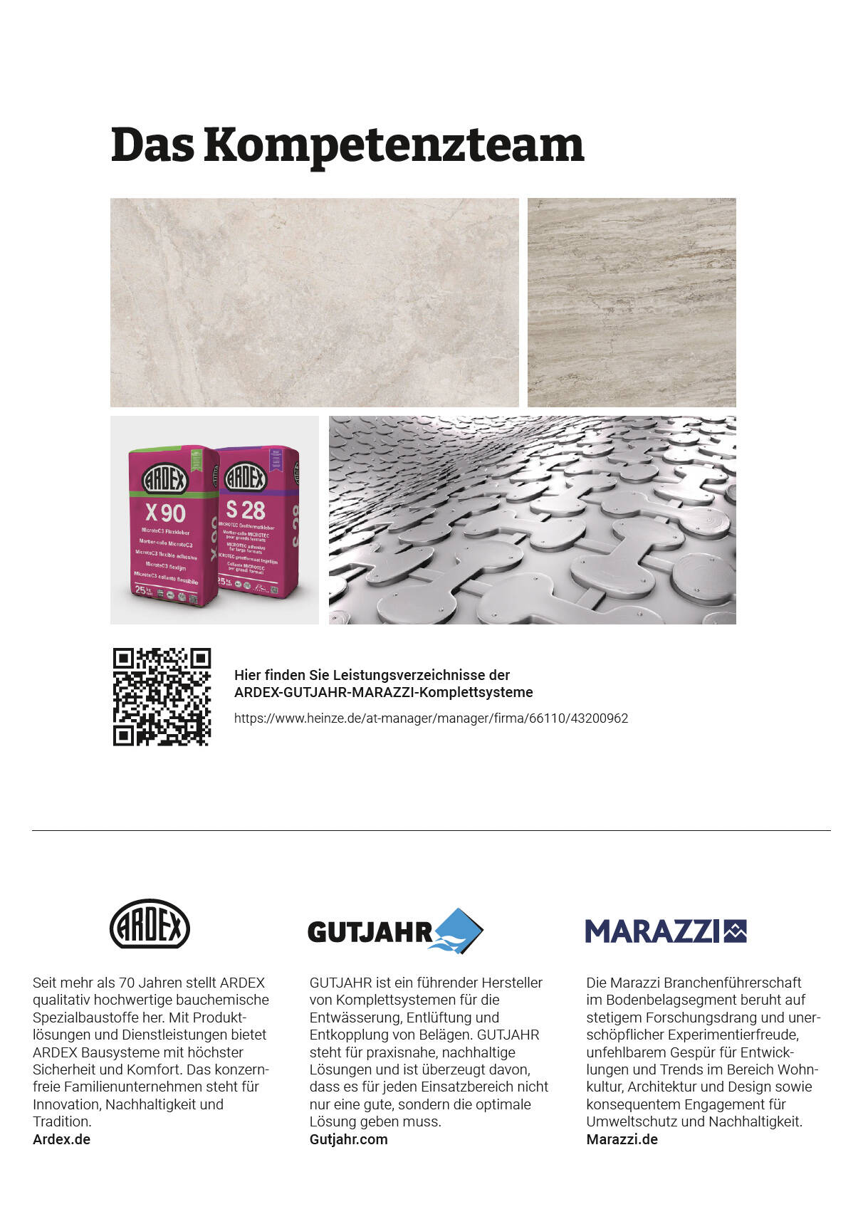 Ob Misch- oder Holzuntergründe, gerissene oder junge Estriche, Altbeläge oder Hohlraumböden: Kritische Untergründe machen die Verlegung großformatiger Keramik- und Natursteinbeläge im Innenbereich oft zu einer Herausforderung. Umso wichtiger sind hier passende Verlegematerialien. Der Bauchemiehersteller Ardex, der Spezialanbieter Gutjahr und der Keramikhersteller Marazzi haben deshalb zusammen für kritische Bereiche Komplettsysteme entwickelt. Sie sollen Planern und Ausführenden Sicherheit geben und Schäden langfristig verhindern – übersichtlich zusammengestellt in einer Broschüre.