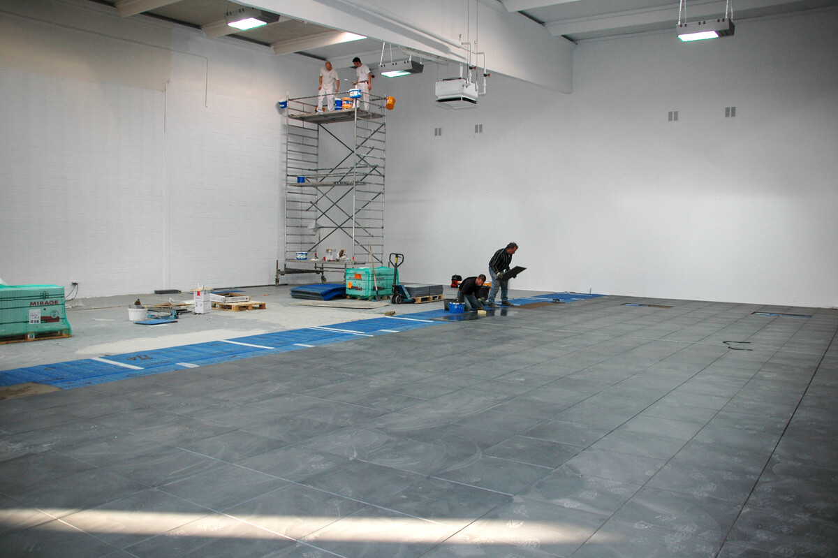 Der vorhandene Untergrund – eine dick aufgetragene Epoxidharzbeschichtung – entpuppte sich als nächstes Problem. Denn Expoxidharz ist für eine Verbundverlegung nicht geeignet. Zudem wies die Oberfläche durch die Reinigung zusätzliche Trennschichten auf. Aber Abfräsen wäre auf dieser großen Fläche extrem mühevoll und staubig geworden. Daher war es sinnvoll, den Belagsaufbau vollständig zu entkoppeln.