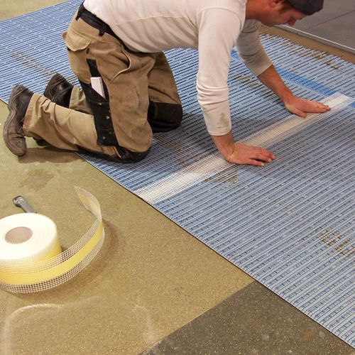 Normalerweise werden Entkopplungssysteme mit dem Untergrund verklebt. Doch durch den haftungsfeindlichen Epoxidharzboden konnte nur ein schwimmend verlegtes System zum Einsatz kommen. Diese Eigenschaften bietet im Markt derzeit nur ein Produkt: IndorTec 2E der Firma Gutjahr. Hierbei ist auf die folienartige Matte eine hochreißfeste Glasgittergewebearmierung aufkaschiert. Alle Stöße sind mit einer Stoßarmierung versehen. Dadurch entsteht ein selbständiger Belagsträger, mit dem sich ein funktionsfähiger Belagsaufbau herstellen lässt – ohne Verbund zum Untergrund. Durch die schwimmende Verlegung wird der Belag vollständig vom Untergrund entkoppelt.