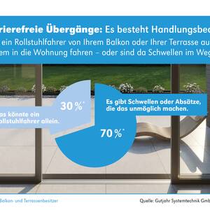 Ohne Schwelle auf Balkon oder Terrasse gelangen: Das ist komfortabel und altersgerecht. Doch die Realität sieht oft anders aus. Bei einer Umfrage des Entwässerungsspezialisten Gutjahr haben 70 Prozent der befragten Balkon- und Terrassenbesitzer angegeben, dass es bei ihrer Wohnung hohe Schwellen an diesem Übergang gibt. Der Handlungsbedarf ist also groß – denn selbst wenige Zentimeter können ein echtes Hindernis sein.